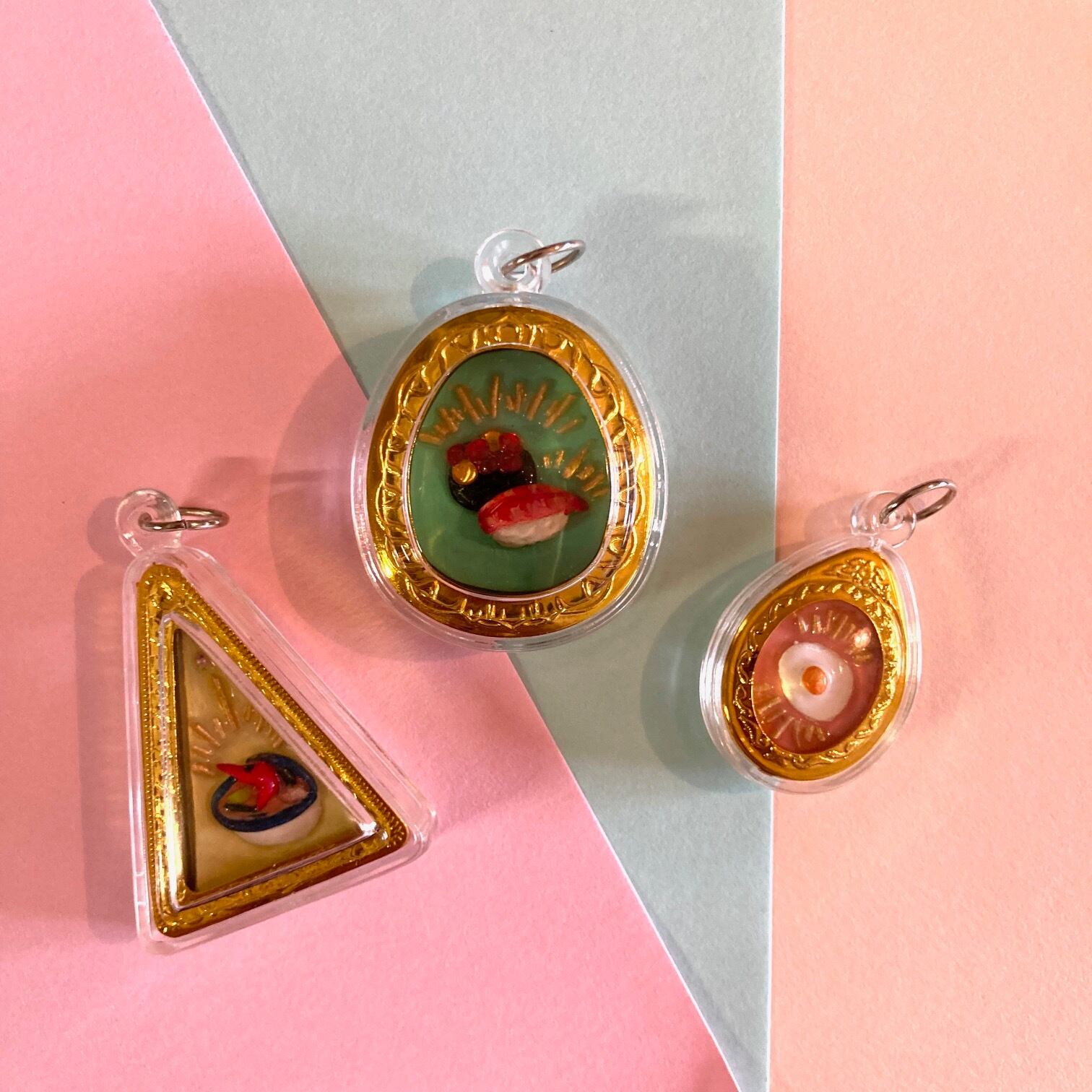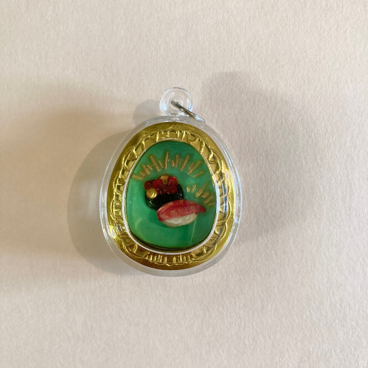 chiugsa tomitaによる、タイのお守り、プラクルアンケースに石膏/樹脂粘土でつくった小さなスカルプチャーのラッキーチャーム。それぞれのシンボルに意味がこめられています。